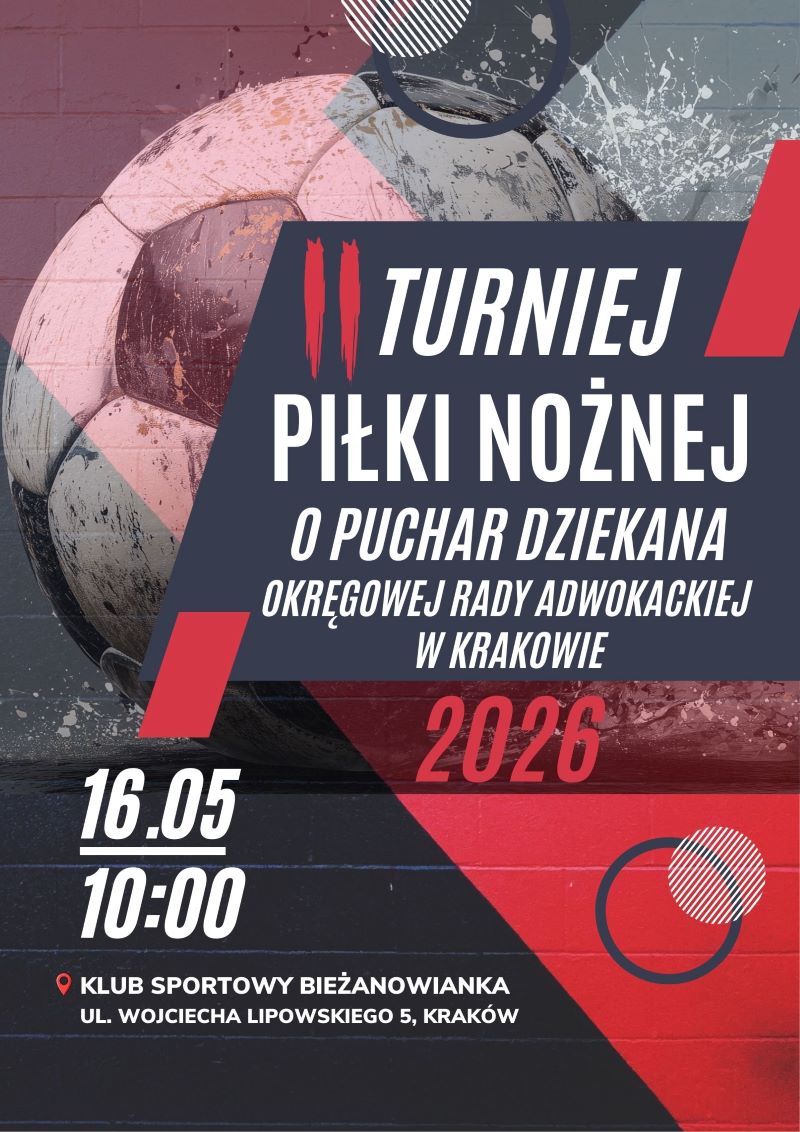 W imieniu adw. Aleksandra Guta, Dziekana Okręgowej Rady Adwokackiej w Krakowie, przekazujemy zaproszenie na ,,II Turniej Piłki Nożnej Prawników o Puchar Dziekana Okręgowej Rady Adwokackiej w Krakowie – 2026”, który odbędzie się w dniu 16 maja 2026 r. w godz. 10.00-17.00 na obiektach Klubu Sportowego Bieżanowianka przy ul. Lipowskiego 5 w Krakowie.