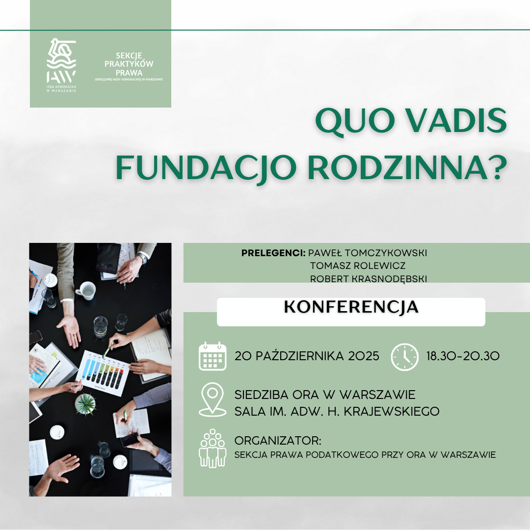 Sekcja Prawa Podatkowego przy Okręgowej Radzie Adwokackiej w Warszawie ma przyjemność zaprosić na otwarte spotkanie poświęcone tematyce fundacji rodzinnych.