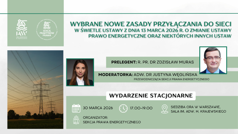 Sekcja Prawa Energetycznego przy ORA w Warszawie zaprasza na szkolenie pt. „Wybrane nowe zasady przyłączania do sieci w świetle ustawy z dnia 13 marca 2026 r. o zmianie ustawy Prawo energetyczne oraz niektórych innych ustaw”, które odbędzie się w poniedziałek, 30 marca 2026 r. o godz. 17.00 w siedzibie Okręgowej Rady Adwokackiej w Warszawie.