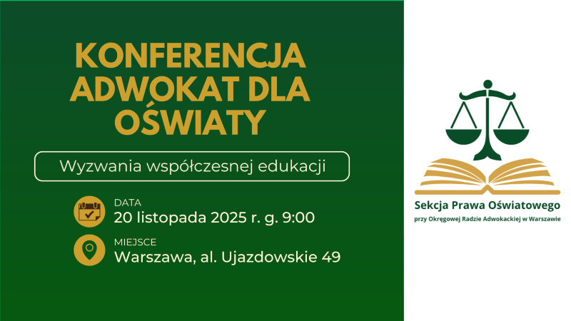 Sekcja Prawa Oświatowego przy ORA w Warszawie oraz Sekcje Praktyków Prawa Okręgowej Rady Adwokackiej w Warszawie serdecznie zapraszają wszystkich zainteresowanych tematyką prawa oświatowego, edukacji oraz ostatnich zmian w polskiej oświacie na Ogólnopolską Konferencję ADWOKAT DLA OŚWIATY, która odbędzie się w czwartek, 20 listopada 2025 r., w godz. 9.00 – 17.00 w siedzibie Okręgowej Rady Adwokackiej w Warszawie, al. Ujazdowskie 49 (sala im. adw. H. Krajewskiego).