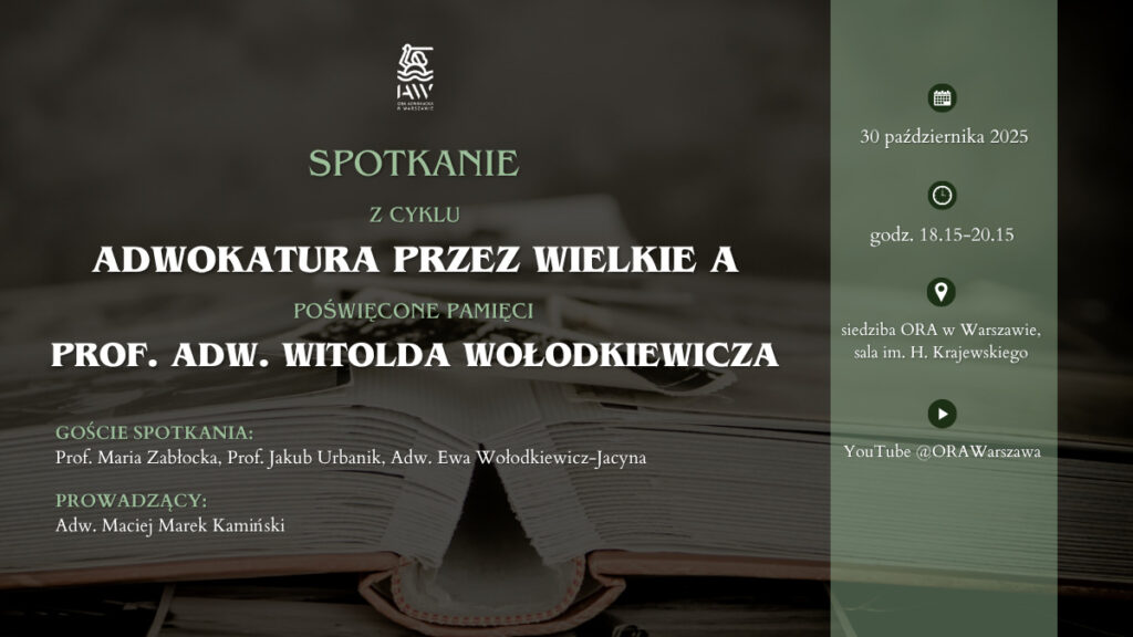 Dziekan Okręgowej Rady Adwokackiej w Warszawie adw. dr Katarzyna Gajowniczek-Pruszyńska oraz Komisja Historii i Tradycji Adwokatury Warszawskiej ORA w Warszawie serdecznie zapraszają na kolejne spotkanie z cyklu „Adwokatura przez wielkie A” poświęcone pamięci wybitnego polskiego romanisty, profesora nauk prawnych, adw. Witolda Wołodkiewicza, specjalisty w zakresie prawa rzymskiego i europejskiej kultury prawnej oraz znawcy kultury antycznej.