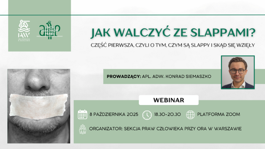 Sekcja Praw Człowieka przy ORA w Warszawie serdecznie zaprasza na szkolenie on-line „Jak walczyć ze SLAPPami? Część pierwsza, czyli o tym, czym są SLAPPy i skąd się wzięły”, które odbędzie się w środę, 8 października br. w godz. 18.30-20.30.