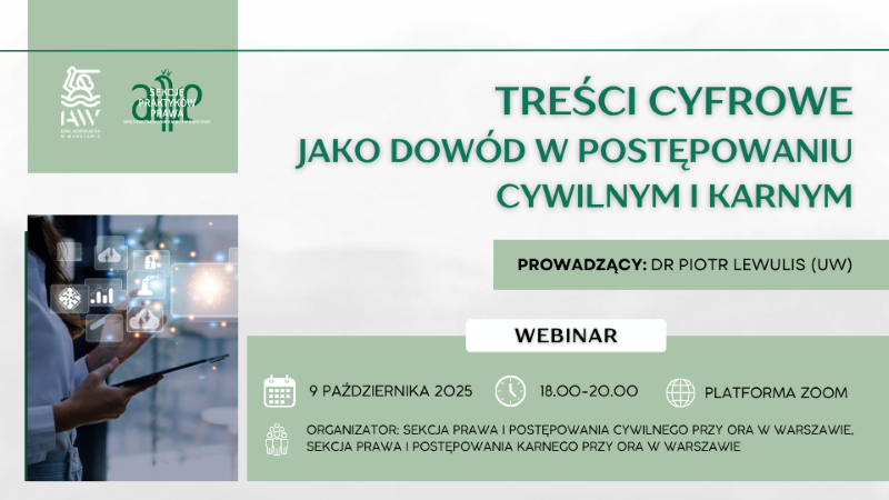 Sekcja Prawa i Postępowania Cywilnego przy Okręgowej Radzie Adwokackiej w Warszawie oraz Sekcja Prawa i Postępowania Karnego przy Okręgowej Radzie Adwokackiej w Warszawie serdecznie zapraszając na szkolenie „Treści cyfrowe jako dowód w postępowaniu cywilnym i karnym”, które odbędzie się w czwartek, 9 października 2025 r., w godz. 18.00–20.00 na platformie Zoom.
