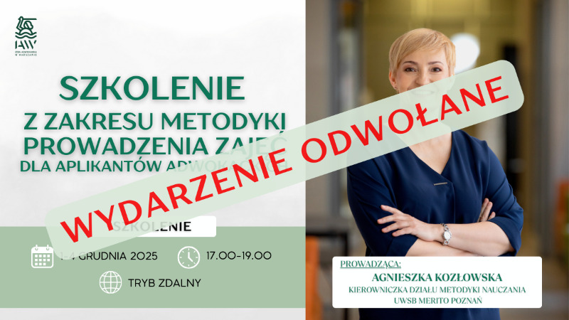 Dział Szkolenia Aplikantów Adwokackich serdecznie zaprasza na obowiązkowe szkolenie zorganizowane dla wykładowców Izby Adwokackiej w Warszawie.