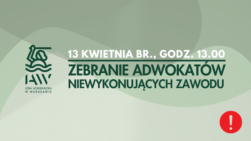 Dziekan ORA w Warszawie adw. dr Katarzyna Gajowniczek-Pruszyńska zwołała na dzień 13 kwietnia 2026 r. (poniedziałek), na godz. 13.00, w trybie zdalnym, zebranie adwokatów niewykonujących zawodu adwokata w celu wyboru delegatów na Zgromadzenie Izby Adwokackiej w Warszawie.