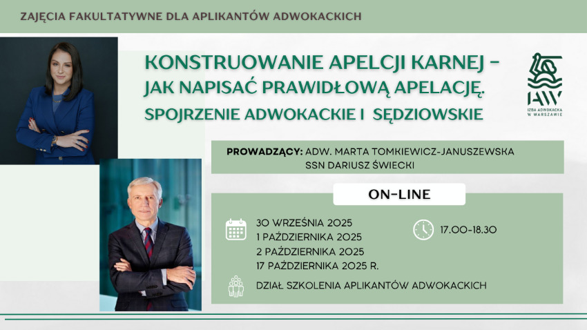 W związku ze zbliżającym się kolokwium rocznym dla aplikantów adwokackich Okręgowa Rada Adwokacka w Warszawie przygotowała kolejną edycję zajęć fakultatywnych pt. „Konstruowanie apelacji karnej. Jak napisać prawidłową apelację? Spojrzenie adwokackie i sędziowskie”, które prowadzone będą przez adw. Martę Tomkiewicz-Januszewską oraz SSN Dariusza Świeckiego.