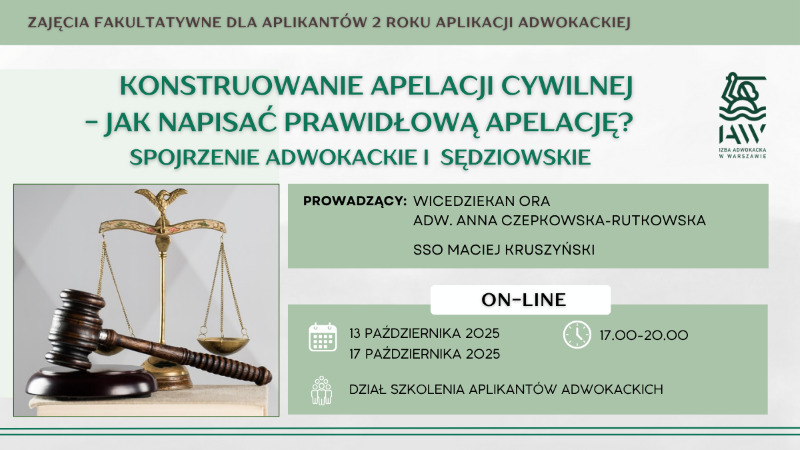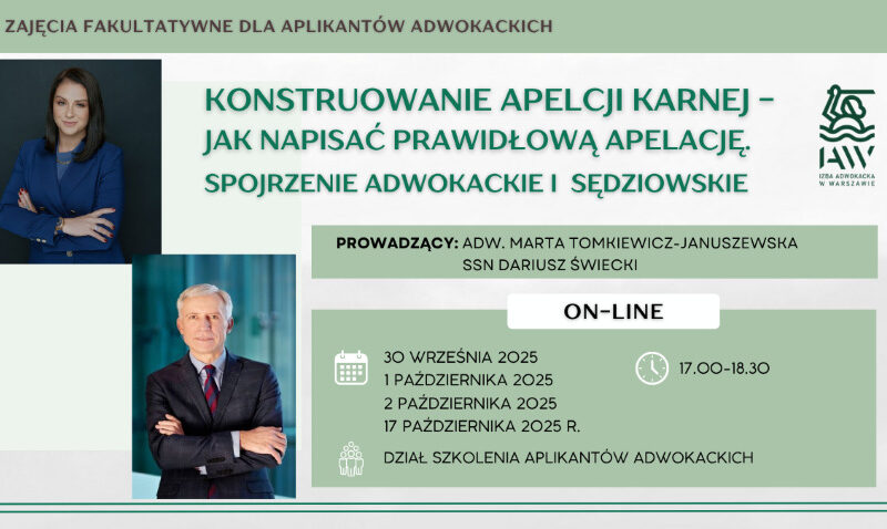 W związku ze zbliżającym się kolokwium rocznym dla aplikantów adwokackich Okręgowa Rada Adwokacka w Warszawie przygotowała kolejną edycję zajęć fakultatywnych pt. „Konstruowanie apelacji...
