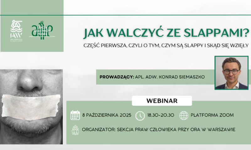 Sekcja Praw Człowieka przy ORA w Warszawie serdecznie zaprasza na szkolenie on-line "Jak walczyć ze SLAPPami Część pierwsza, czyli o tym, czym są SLAPPy i skąd się wzięły", które odbędzie...