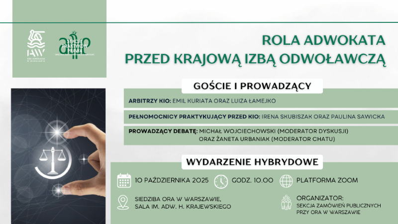 Sekcja Zamówień Publicznych przy Okręgowej Radzie Adwokackiej w Warszawie zaprasza na wydarzenie pn. „Rola adwokata przed Krajową Izbą Odwoławczą”, które odbędzie się w piątek, 10...