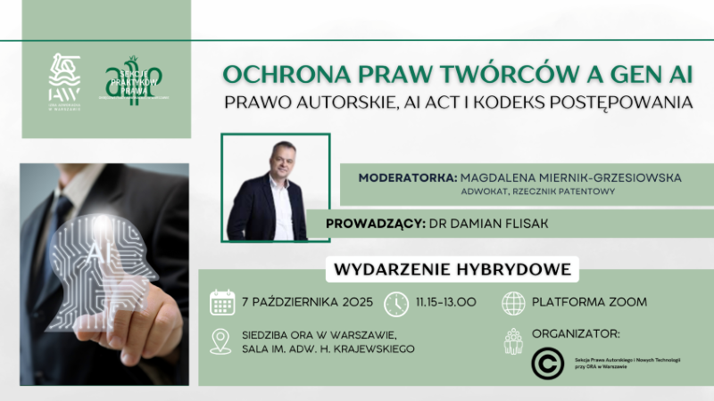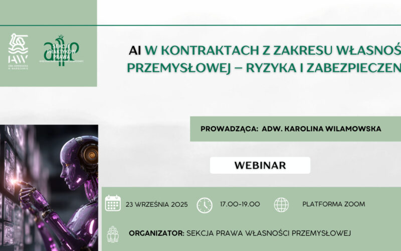 Szanowni Państwo, Sekcja Prawa Własności Przemysłowej przy ORA w Warszawie zaprasza na webinar pt.: AI w kontraktach z zakresu własności przemysłowej – ryzyka i zabezpieczenia.