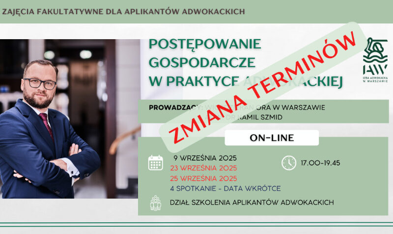 Szanowni Państwo, informujemy, iż zmianie uległy terminy zajęć fakultatywnych nt. postępowania gospodarczego w praktyce adwokackiej.