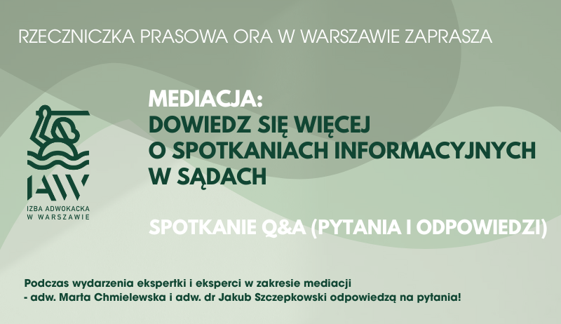 Rzeczniczka Prasowa ORA w Warszawie adw. Maria Sankowska-Borman serdecznie zaprasza na spotkanie typu Q&A na temat "Mediacja: dowiedz się więcej o spotkaniach informacyjnych w sądach"....